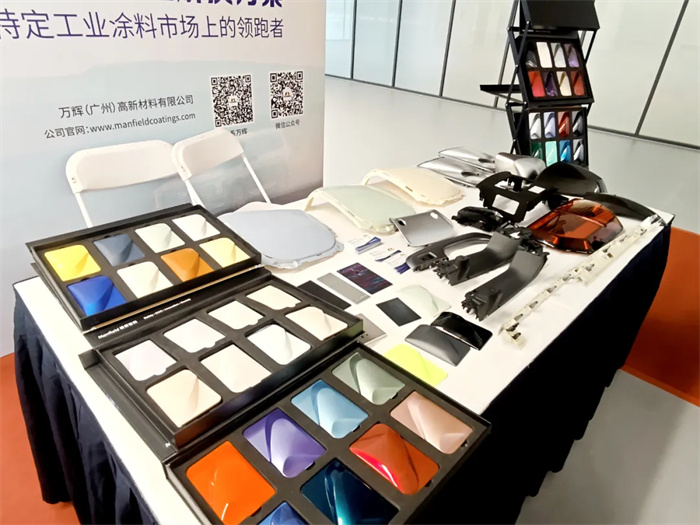 經過前期對客戶需求的調研和配套的產品升級,萬輝展臺迎來了廣汽研究院團隊的重點關注和進一步的深度交流。我們向客戶展示了萬輝云石效果漆、仿電鍍銀效果漆、抗指紋效果漆、極度啞黑漆、高亮光鋼琴黑、UV打印效果、冰花效果和眾多當下流行色彩等,其中,萬輝云石效果漆、仿電鍍銀效果漆和極度啞黑漆等備受客戶的青睞與認可。